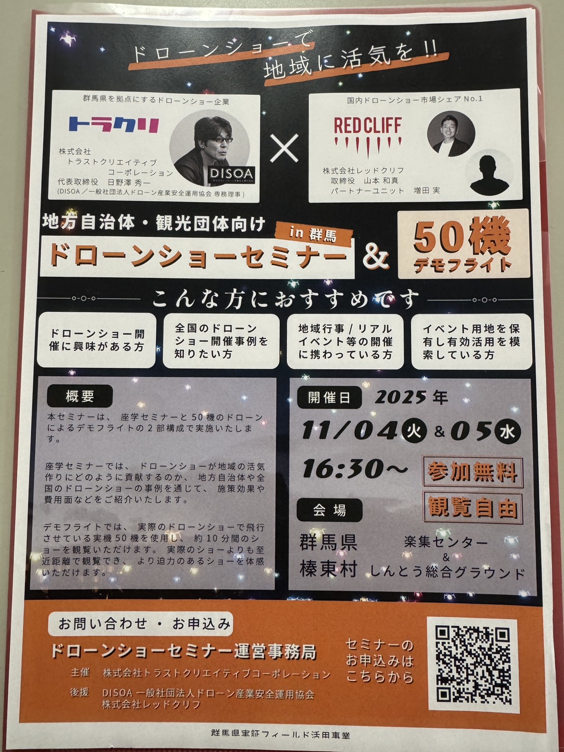 「ドローンショーセミナーin群馬」と題して、1部「座学セミナー」2部「少数機デモフライト(50機)」を「群馬県実証フィールド活用事業」として実施致しました。