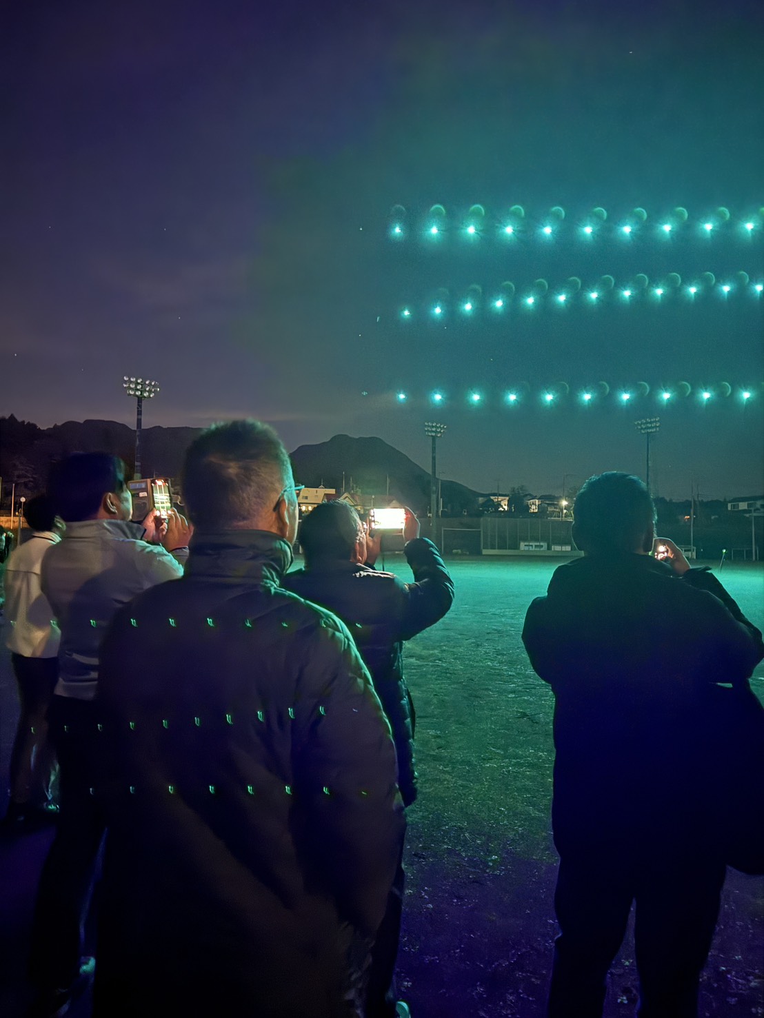 日没後に行ったドローンショーデモフライトでは、少数機にもかかわらず